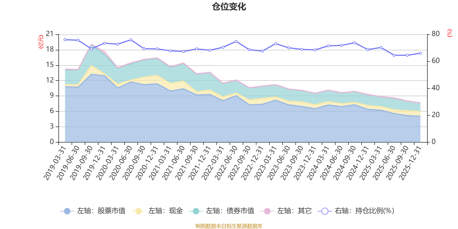 据定期报告数据统计,近三年平均股票仓位为69.28%,同类平均为67.52%。2019年一季度末基金达到76.04%的最高仓位,2025年上半年末最低,为64.48%。