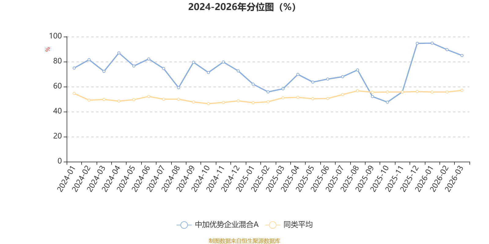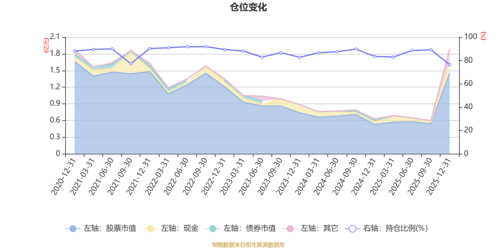 据定期报告数据统计,近三年平均股票仓位为85.46%,同类平均为84.04%。2022年三季度末基金达到91.9%的最高仓位,2025年末最低,为76.46%。
