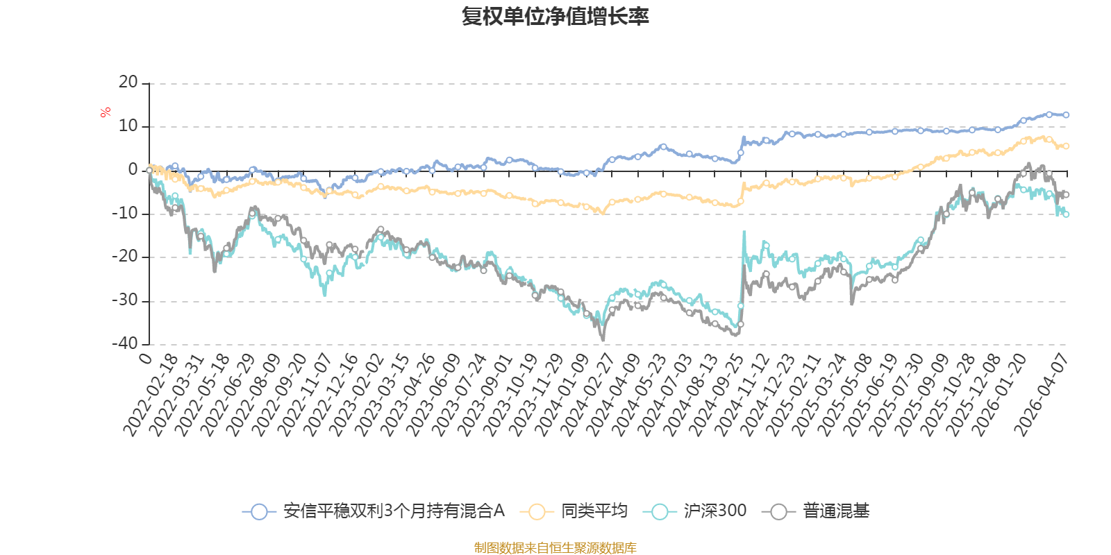 截至4月7日,安信平稳双利3个月持有混合A近三个月复权单位净值增长率为2.29%,位于同类可比基金54/629;近半年复权单位净值增长率为3.50%,位于同类可比基金81/629;近一年复权单位净值增长率为4.14%,位于同类可比基金495/629;近三年复权单位净值增长率为11.97%,位于同类可比基金236/581。