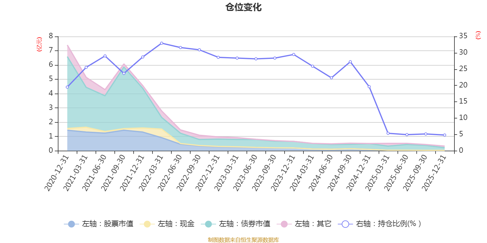 据定期报告数据统计,近三年平均股票仓位为19.15%,同类平均为19.2%。2022年一季度末基金达到32.94%的最高仓位,2025年末最低,为4.83%。