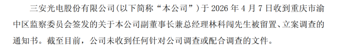 4月8日晚,三安光电股份有限公司(下称“三安光电”)发布公告,公司副董事长兼总经理林科闯被重庆市渝中区监察委员会采取留置措施并立案调查。这是继3月下旬三安光电实际控制人林秀成被留置立案调查后,该公司管理层又一核心人物被留置立案调查。