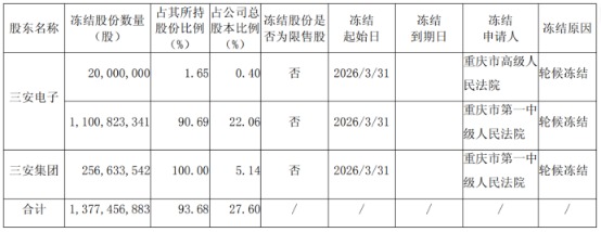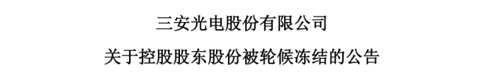 与此同时,三安光电控股股东厦门三安电子有限公司(三安电子)及间接控股股东福建三安集团有限公司(三安集团)持有的股份被司法冻结及轮候冻结,冻结比例合计占公司总股本的27.60%。