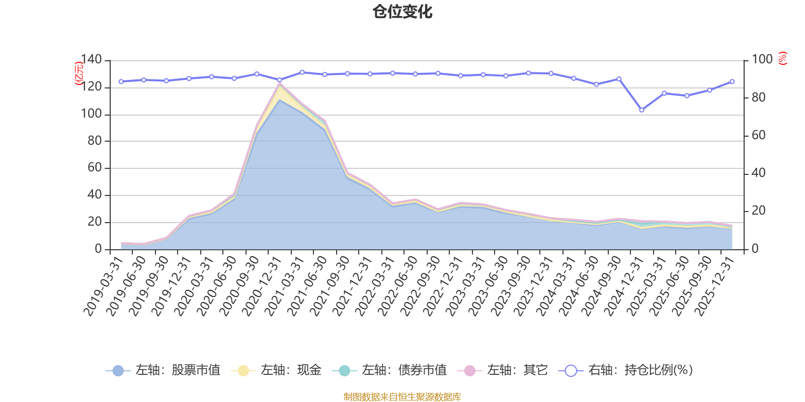 据定期报告数据统计,近三年平均股票仓位为87.41%,同类平均为72.57%。2021年一季度末基金达到93.64%的最高仓位,2024年末最低,为73.76%。