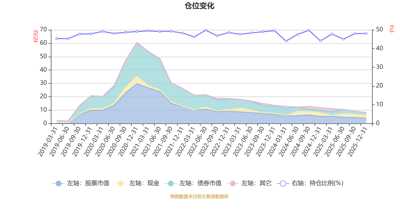 据定期报告数据统计,近三年平均股票仓位为47.42%,同类平均为67.52%。2022年上半年末基金达到49.84%的最高仓位,2024年一季度末最低,为43.99%。