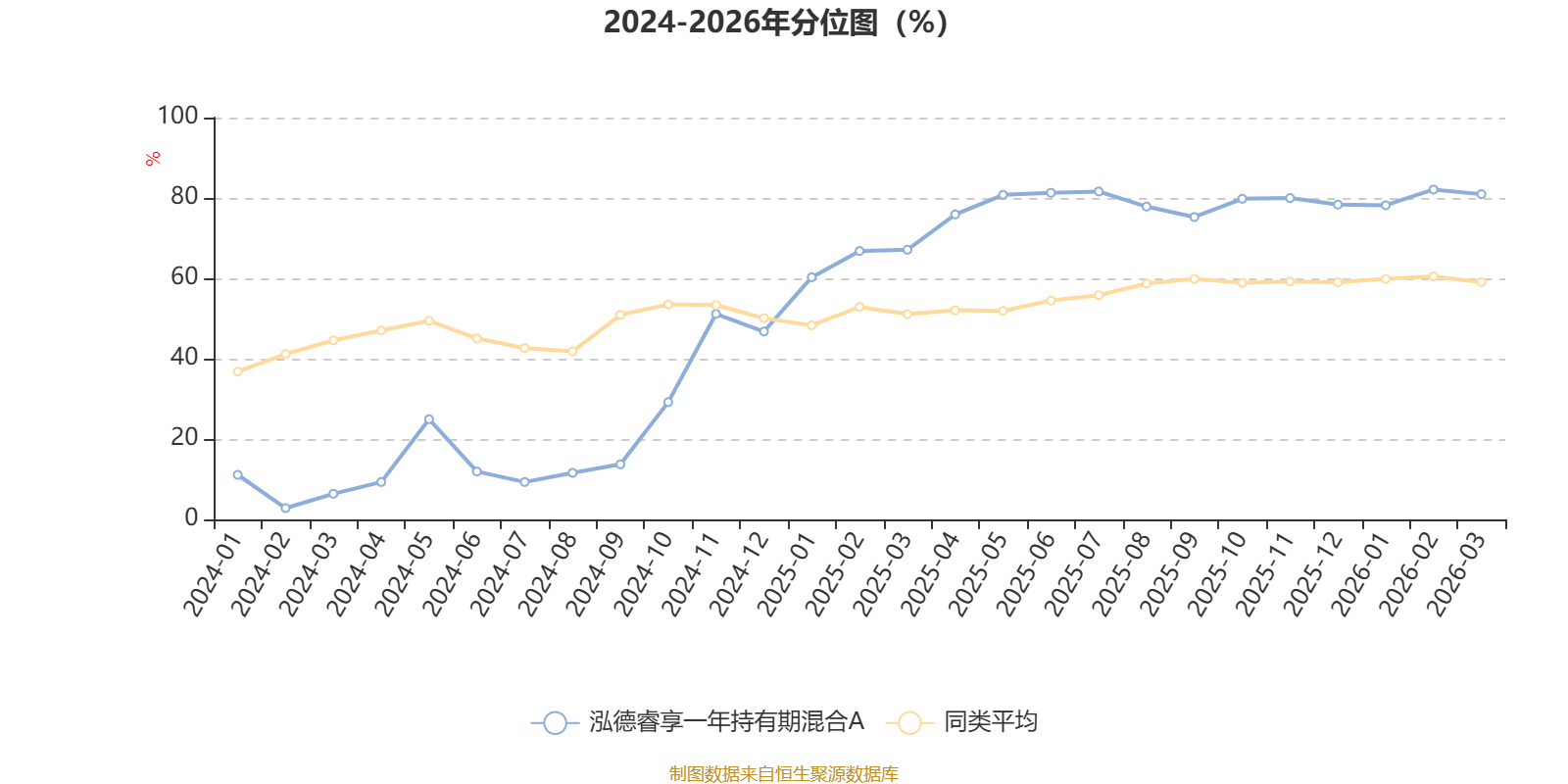 通过所选区间该基金净值增长率分位图,可以观察该基金与同类基金业绩比较情况。图为坐标原点到区间内某时点的净值增长率在同类基金中的分位数。