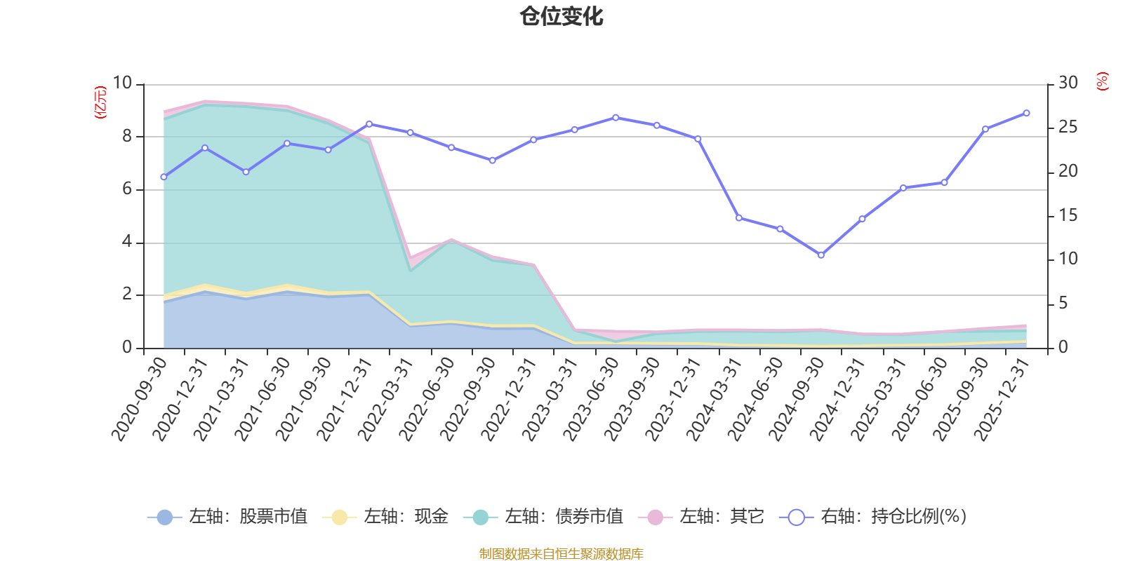 据定期报告数据统计,近三年平均股票仓位为20.2%,同类平均为19.2%。2025年末基金达到26.72%的最高仓位,2024年三季度末最低,为10.58%。
