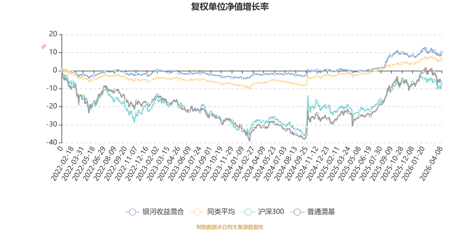 截至4月8日,银河收益混合近三个月复权单位净值增长率为0.36%,位于同类可比基金332/629;近半年复权单位净值增长率为-0.70%,位于同类可比基金542/629;近一年复权单位净值增长率为11.40%,位于同类可比基金144/629;近三年复权单位净值增长率为10.34%,位于同类可比基金308/581。
