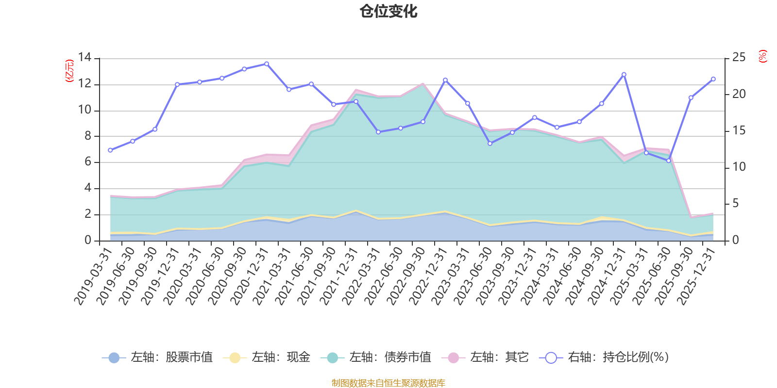 据定期报告数据统计,近三年平均股票仓位为16.83%,同类平均为19.2%。2020年末基金达到24.23%的最高仓位,2025年上半年末最低,为10.97%。