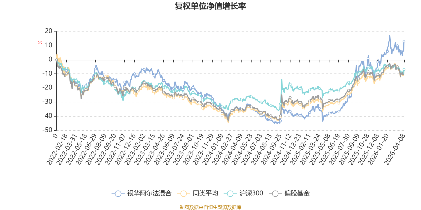 截至4月8日,银华阿尔法混合近三个月复权单位净值增长率为9.26%,位于同类可比基金21/265;近半年复权单位净值增长率为15.79%,位于同类可比基金18/265;近一年复权单位净值增长率为100.81%,位于同类可比基金11/265;近三年复权单位净值增长率为24.10%,位于同类可比基金101/261。