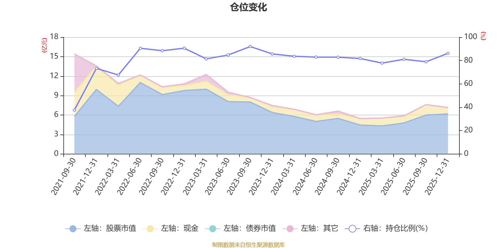 据定期报告数据统计,近三年平均股票仓位为83.26%,同类平均为86.12%。2023年三季度末基金达到92.01%的最高仓位,2021年三季度末最低,为37.57%。