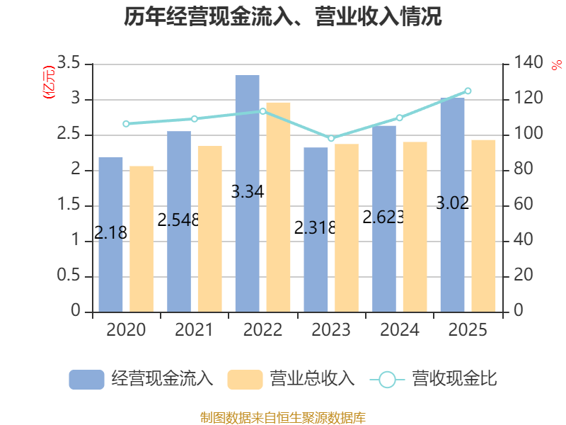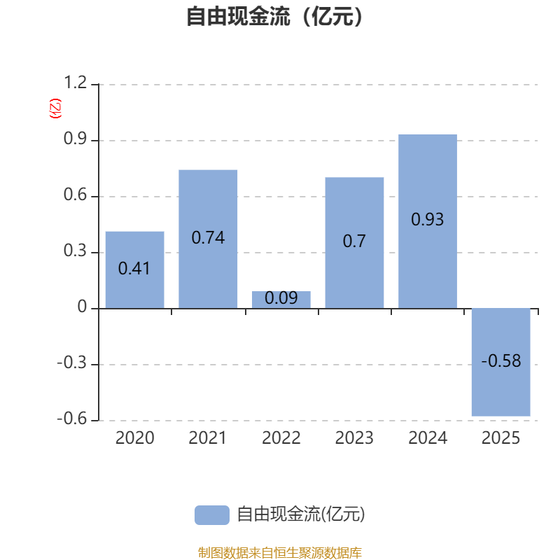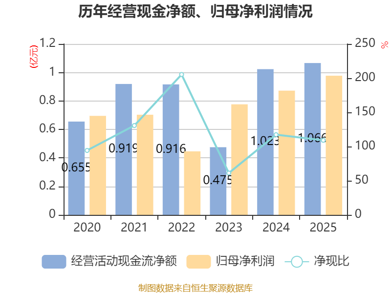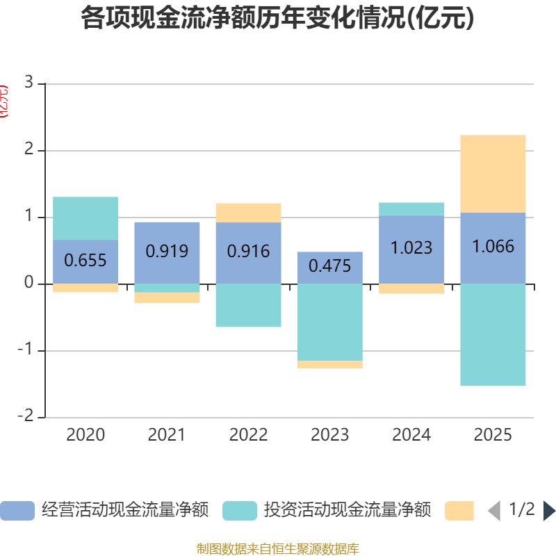 截至2025年,公司经营活动现金流净额为1.07亿元,同比增长4.21%;筹资活动现金流净额1.16亿元,同比增加1.31亿元;投资活动现金流净额-1.53亿元,上年同期为1908.68万元。