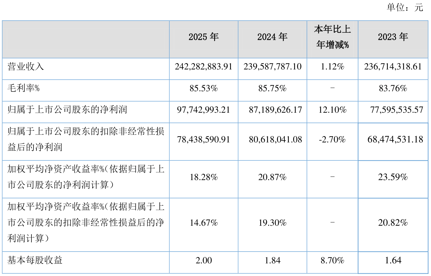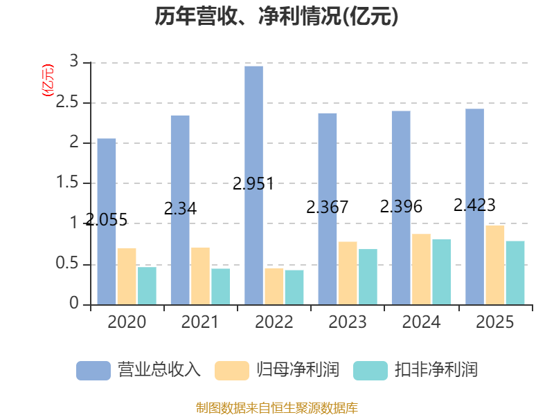 中证智能财讯丹娜生物(920009)4月8日披露2025年年度报告。2025年,公司实现营业总收入2.42亿元,同比增长1.12%;归母净利润9774.3万元,同比增长12.10%;扣非净利润7843.86万元,同比下降2.70%;经营活动产生的现金流量净额为1.07亿元,同比增长4.21%;报告期内,丹娜生物基本每股收益为2.00元,加权平均净资产收益率为18.28%。公司2025年度分配预案为:拟向全体股东每10股转4股,派现5元(含税)。