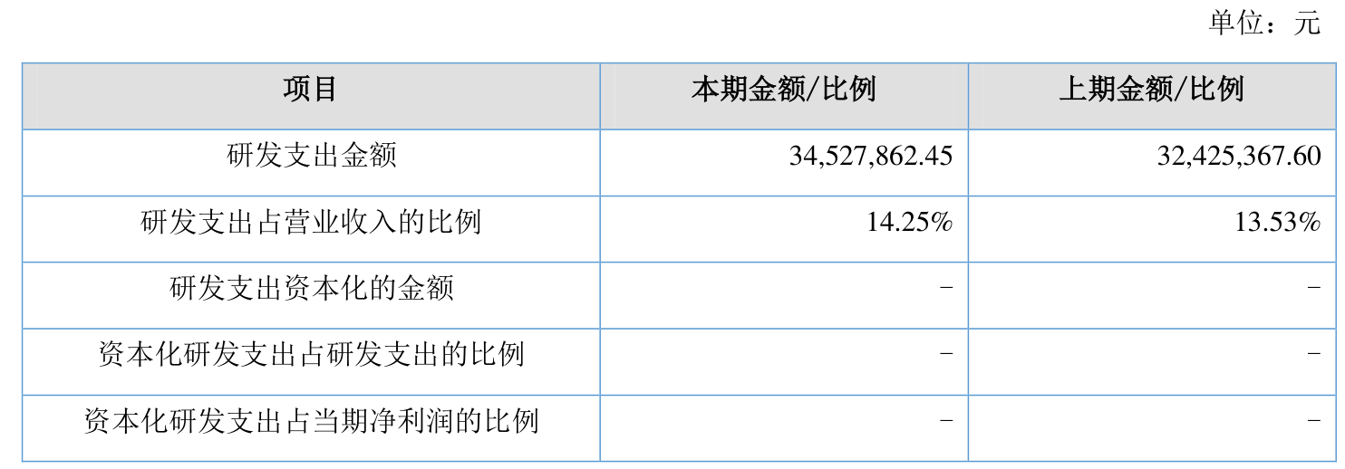 2025年全年,公司研发投入金额为3452.79万元,同比增长6.48%;研发投入占营业收入比例为14.25%,相比上年同期上升0.72个百分点。