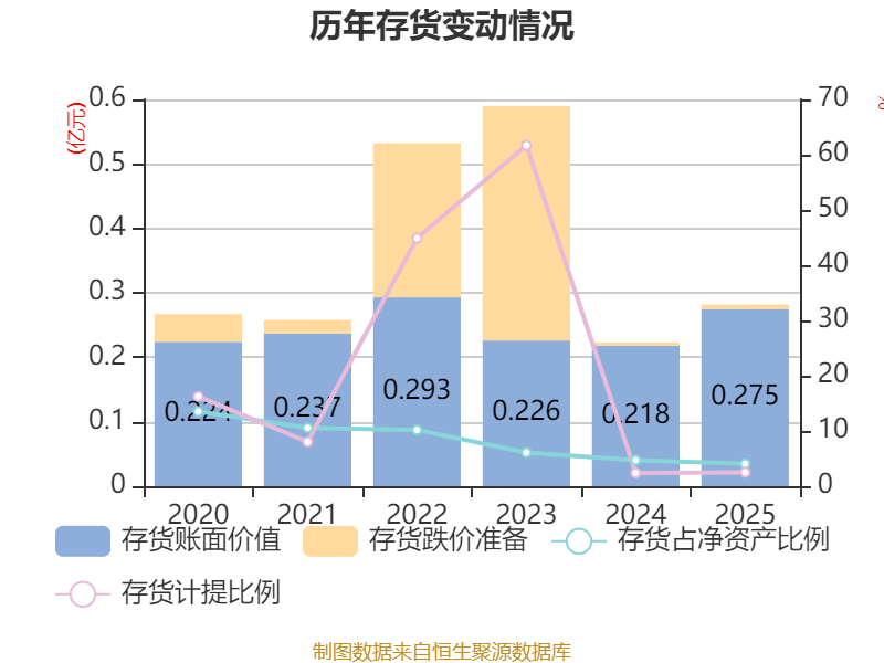 从存货变动来看,截至2025年末,公司存货账面价值为2753.54万元,占净资产的4.06%,较上年末增加575.37万元。其中,存货跌价准备为71.3万元,计提比例为2.52%。