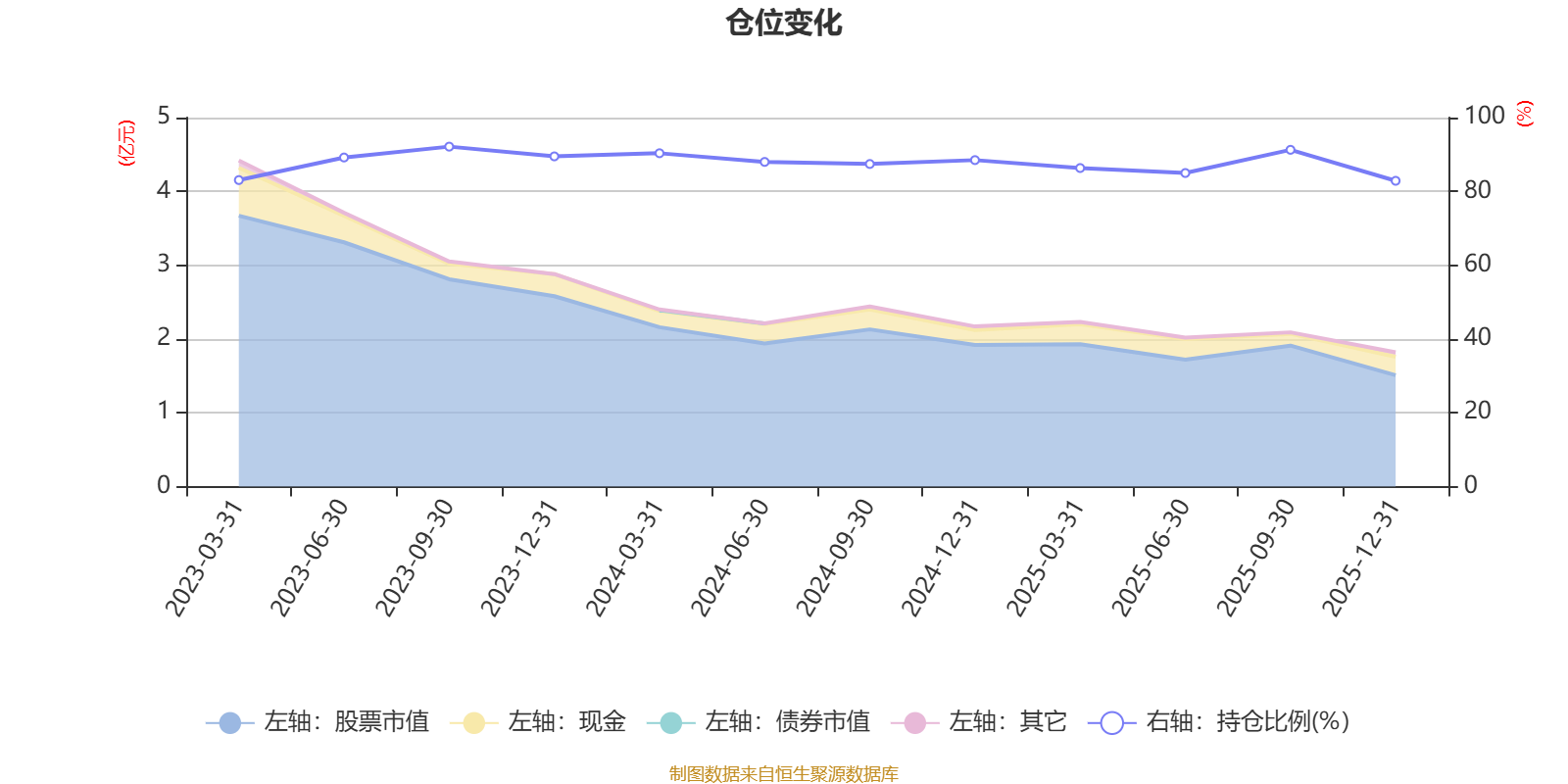 据定期报告数据统计,近三年平均股票仓位为87.8%,同类平均为85.83%。2023年三季度末基金达到92.13%的最高仓位,2025年末最低,为82.87%。