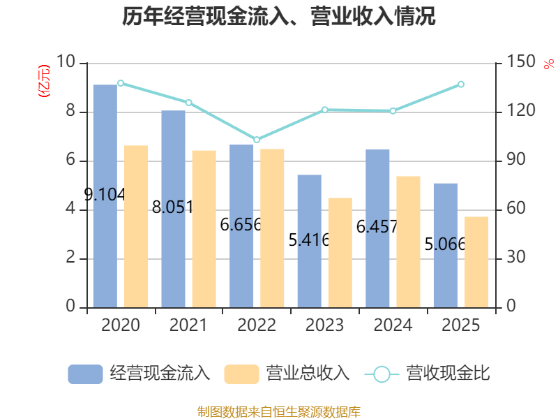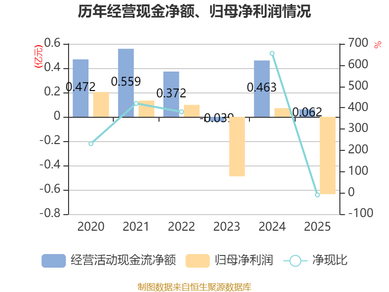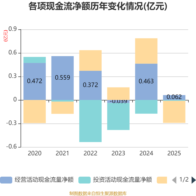 截至2025年,公司经营活动现金流净额为623.3万元,同比下降86.53%;筹资活动现金流净额-2810.95万元,同比减少6053.02万元;投资活动现金流净额-113.68万元,上年同期为-1746.43万元。