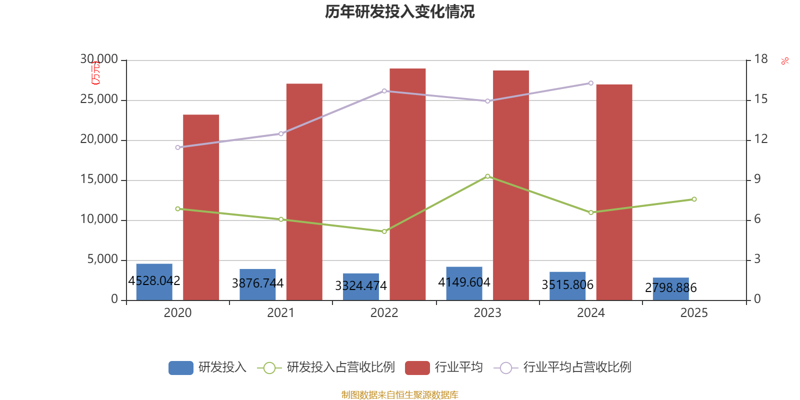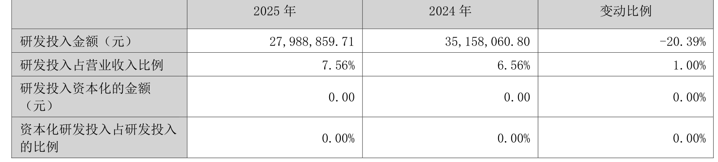 2025年全年,公司研发投入金额为2798.89万元,同比下降20.39%;研发投入占营业收入比例为7.56%,相比上年同期上升1个百分点。此外,公司全年研发投入资本化率为0%。