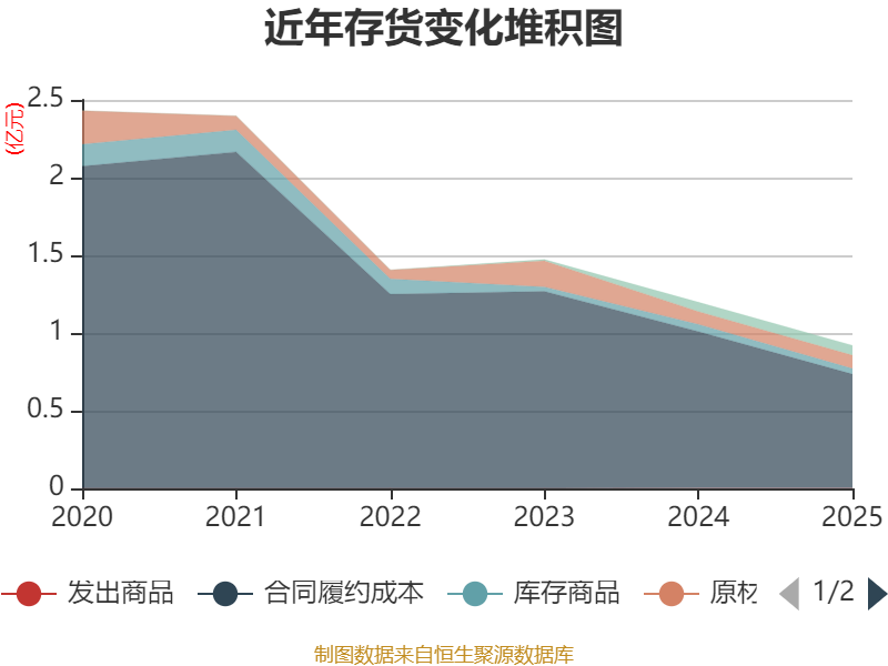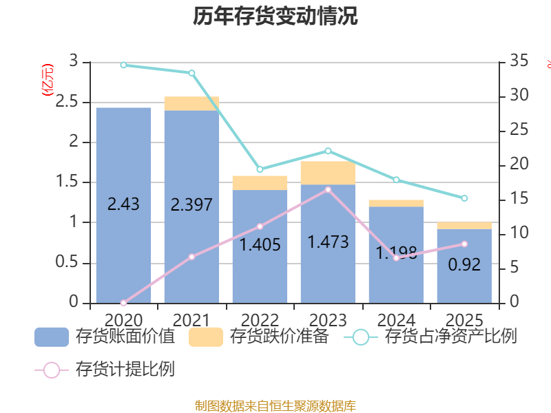 从存货变动来看,截至2025年末,公司存货账面价值为9202.65万元,占净资产的15.2%,较上年末减少2775.41万元。其中,存货跌价准备为860.08万元,计提比例为8.55%。