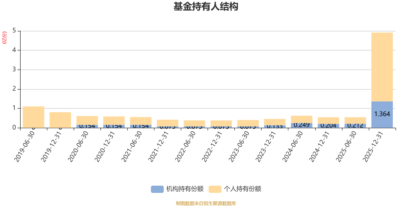 截至2025年12月31日,基金持有人共计7550户,合计持有4.92亿份。其中管理人员工持有280.69万份,占比0.57%,机构持有份额占比27.75%,个人投资者占比72.25%。