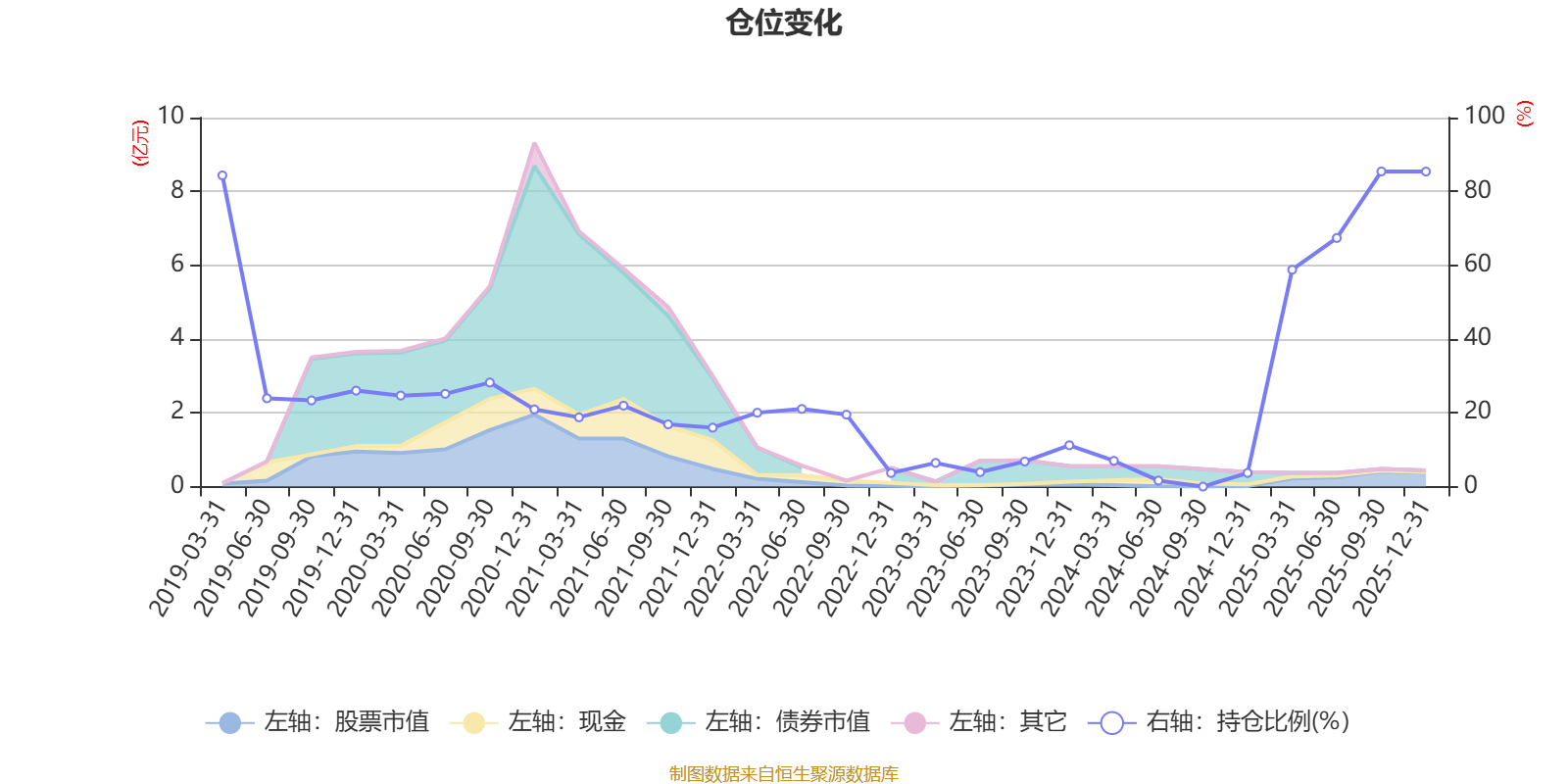 据定期报告数据统计,近三年平均股票仓位为28.13%,同类平均为72.57%。2025年三季度末基金达到85.41%的最高仓位,2024年上半年末最低,为1.62%。
