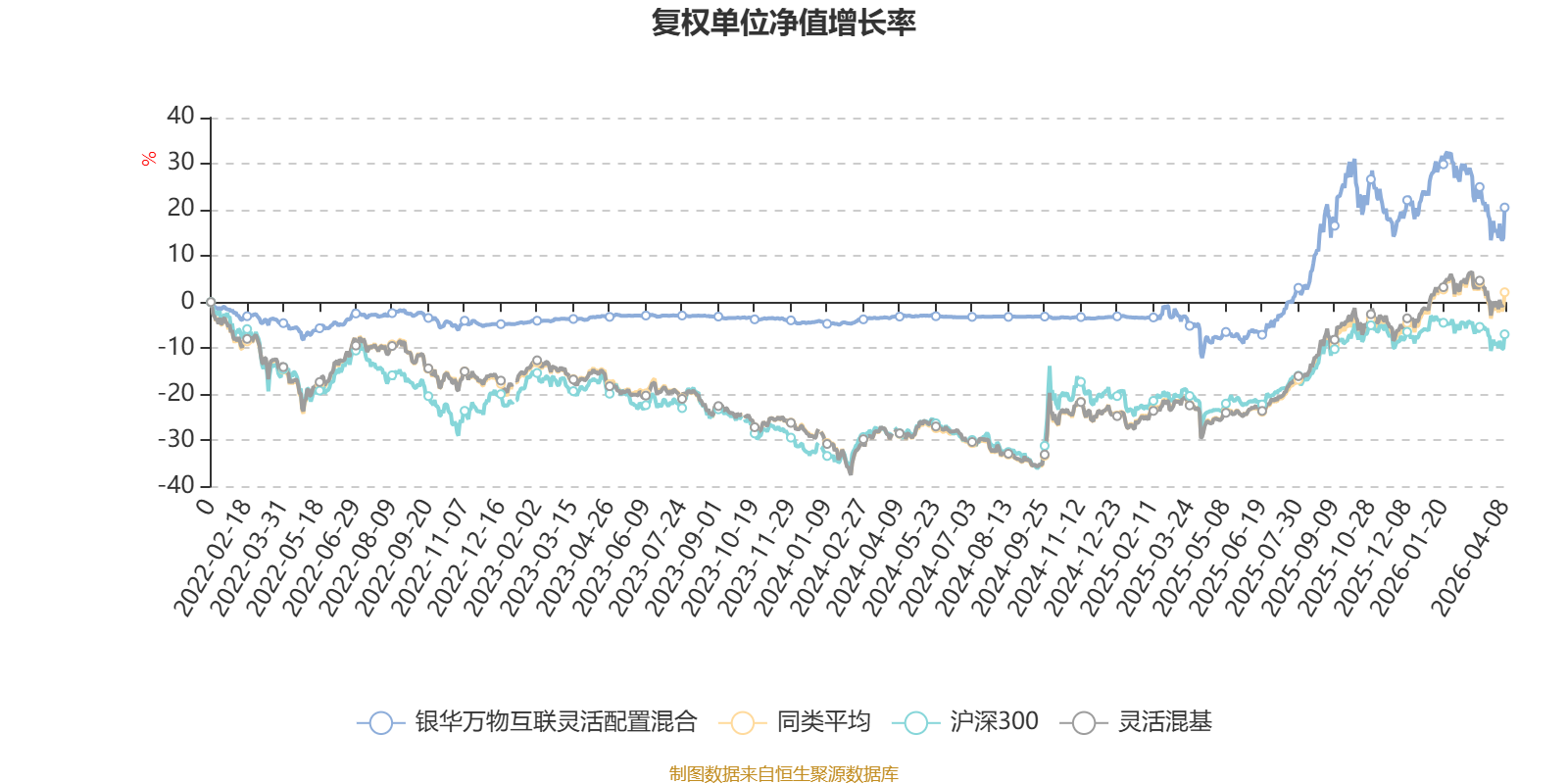 截至4月8日,银华万物互联灵活配置混合近三个月复权单位净值增长率为-5.93%,位于同类可比基金1111/1287;近半年复权单位净值增长率为-7.31%,位于同类可比基金1130/1286;近一年复权单位净值增长率为37.11%,位于同类可比基金562/1286;近三年复权单位净值增长率为24.51%,位于同类可比基金414/1286。