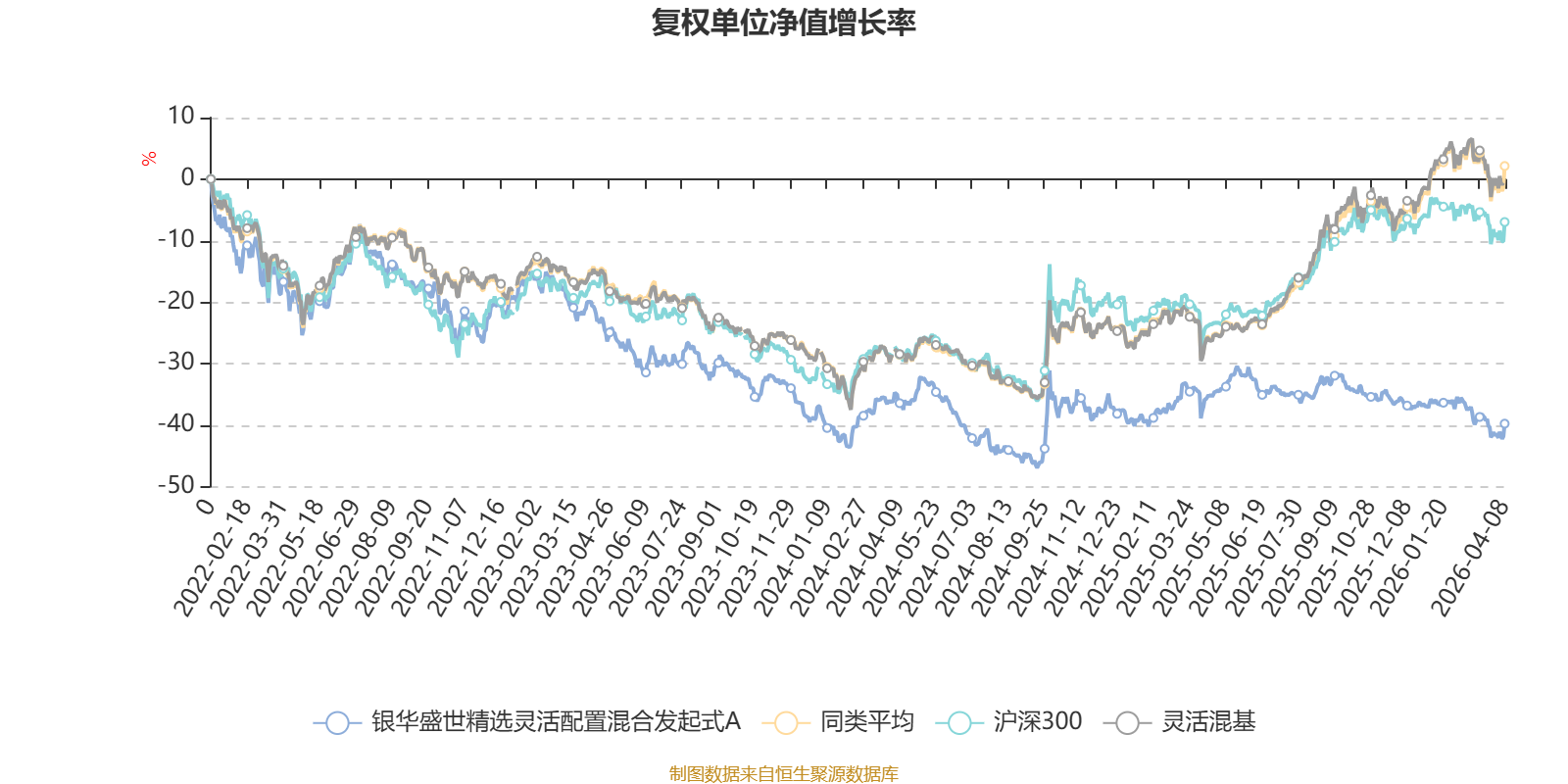 截至4月8日,银华盛世精选灵活配置混合发起式A近三个月复权单位净值增长率为-5.20%,位于同类可比基金1088/1287;近半年复权单位净值增长率为-8.40%,位于同类可比基金1155/1286;近一年复权单位净值增长率为-3.20%,位于同类可比基金1271/1286;近三年复权单位净值增长率为-24.08%,位于同类可比基金1237/1286。