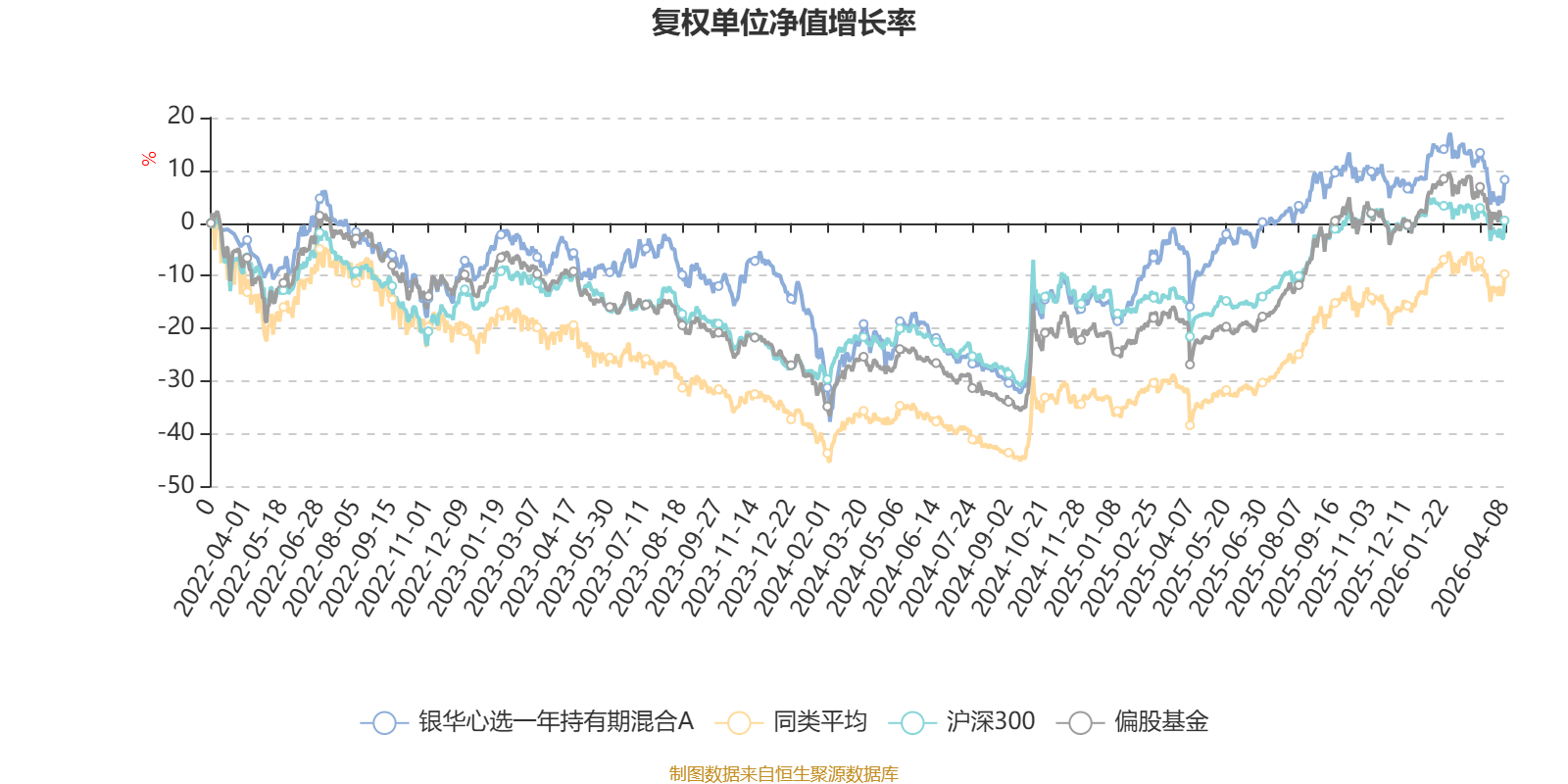 截至4月8日,银华心选一年持有期混合A近三个月复权单位净值增长率为-3.96%,位于同类可比基金462/621;近半年复权单位净值增长率为-3.97%,位于同类可比基金465/621;近一年复权单位净值增长率为26.81%,位于同类可比基金453/618;近三年复权单位净值增长率为12.25%,位于同类可比基金302/559。
