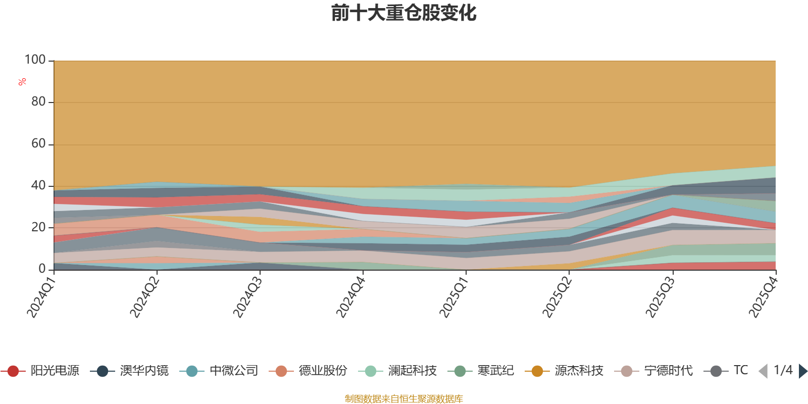 截至2025年末,基金十大重仓股分别是中际旭创、宁德时代、寒武纪、海光信息、中芯国际、迈为股份、阳光电源、北方华创、同花顺、澜起科技。