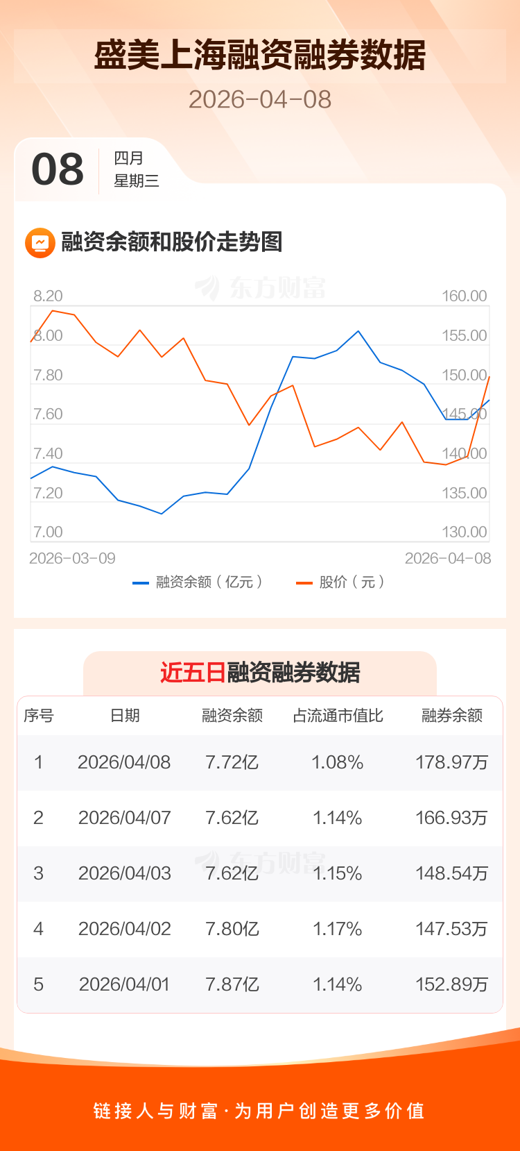 交易所最新数据显示,盛美上海于2026年4月8日获融资买入8583.39万元,融资偿还7568.34万元,当日融资净买入1015.06万元。目前,该股融资余额7.72亿,占流通市值比例为1.08%。