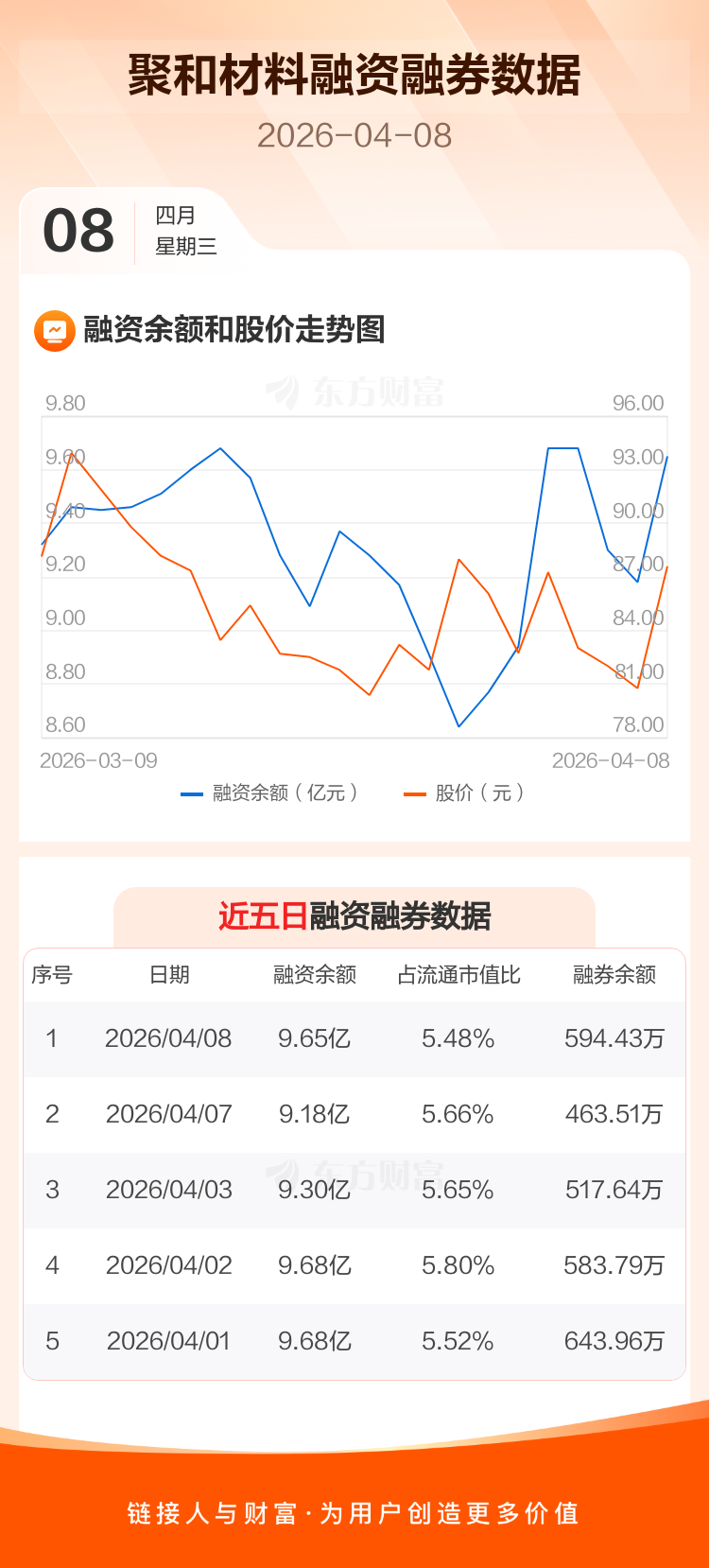 交易所最新数据显示,聚和材料于2026年4月8日获融资买入1.41亿元,融资偿还9394.92万元,当日融资净买入4702.36万元。目前,该股融资余额9.65亿,占流通市值比例为5.48%。