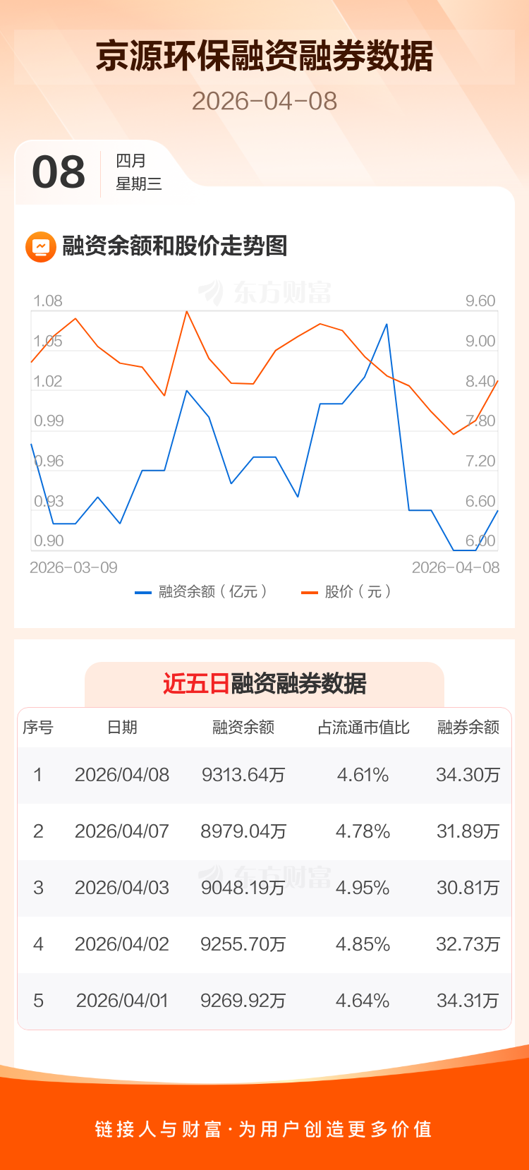 交易所最新数据显示,京源环保于2026年4月8日获融资买入1001.60万元,融资偿还667.00万元,当日融资净买入334.6万元。目前,该股融资余额9313.64万,占流通市值比例为4.61%。
