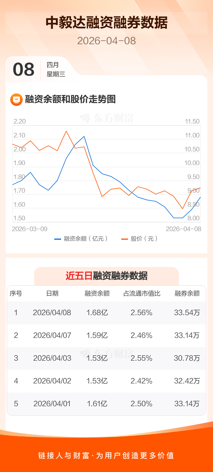 交易所最新数据显示,中毅达于2026年4月8日获融资买入2443.73万元,融资偿还1587.37万元,当日融资净买入856.36万元。目前,该股融资余额1.68亿,占流通市值比例为2.56%。