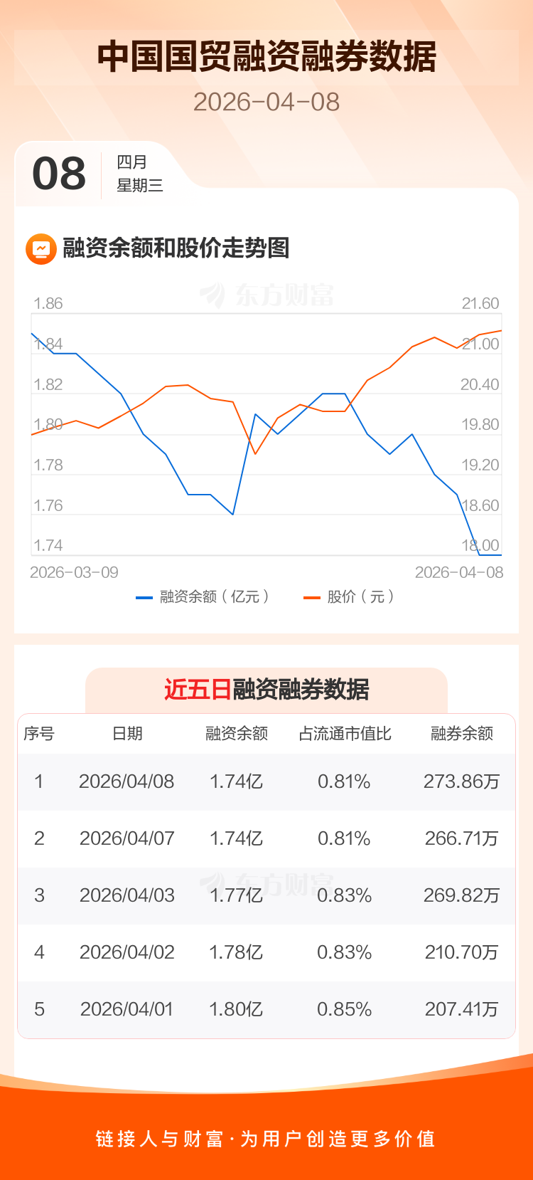 交易所最新数据显示,中国国贸于2026年4月8日获融资买入434.01万元,融资偿还408.96万元,当日融资净买入25.05万元。目前,该股融资余额1.74亿,占流通市值比例为0.81%。