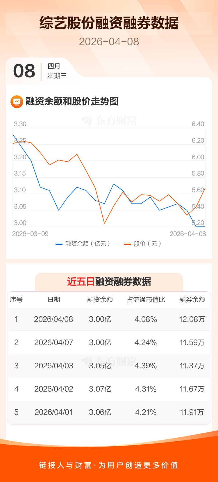 交易所最新数据显示,综艺股份于2026年4月8日获融资买入1370.01万元,融资偿还1319.55万元,当日融资净买入50.47万元。目前,该股融资余额3.00亿,占流通市值比例为4.08%。