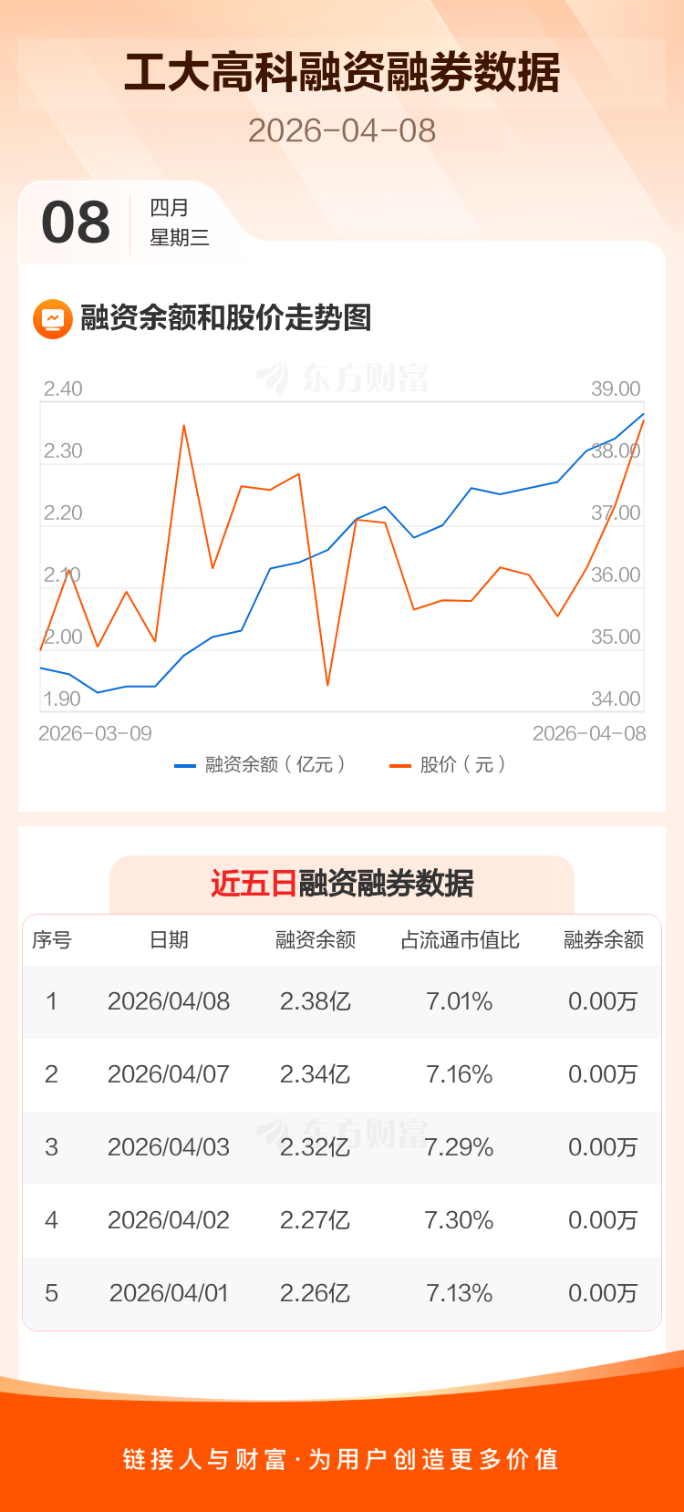 交易所最新数据显示,工大高科于2026年4月8日获融资买入2006.66万元,融资偿还1662.44万元,当日融资净买入344.23万元。目前,该股融资余额2.38亿,占流通市值比例为7.01%。