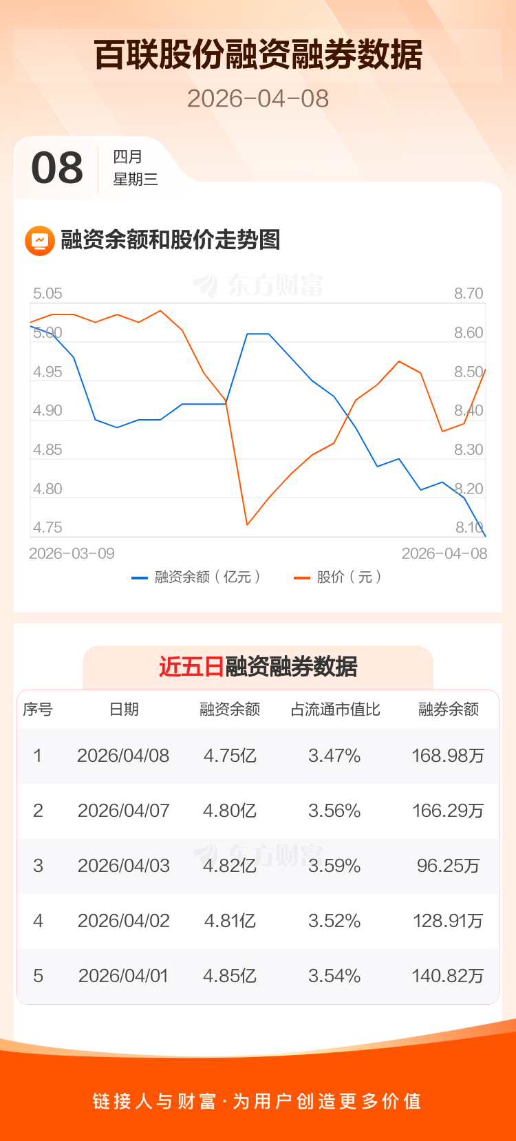 交易所最新数据显示,百联股份于2026年4月8日获融资买入822.43万元,融资偿还1267.71万元,当日融资净偿还445.28万元。目前,该股融资余额4.75亿,占流通市值比例为3.47%。