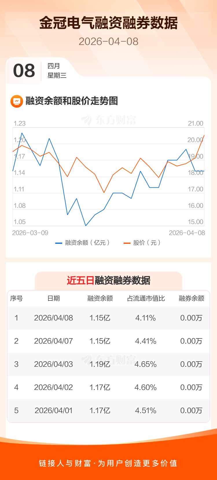 交易所最新数据显示,金冠电气于2026年4月8日获融资买入2225.76万元,融资偿还2241.81万元,当日融资净偿还16.05万元。目前,该股融资余额1.15亿,占流通市值比例为4.11%。
