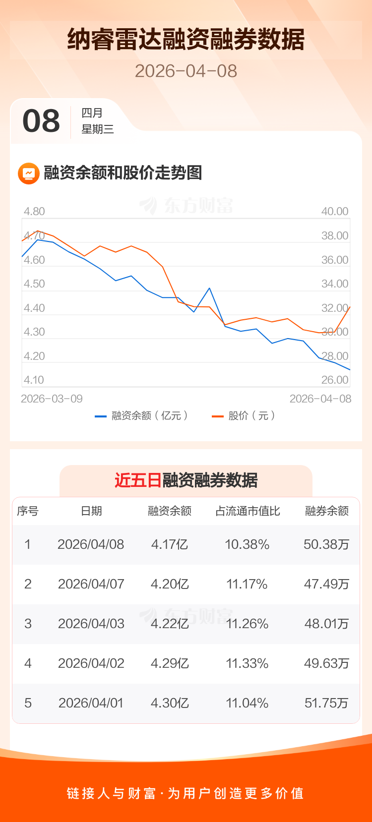 交易所最新数据显示,纳睿雷达于2026年4月8日获融资买入1530.87万元,融资偿还1788.41万元,当日融资净偿还257.55万元。目前,该股融资余额4.17亿,占流通市值比例为10.38%。