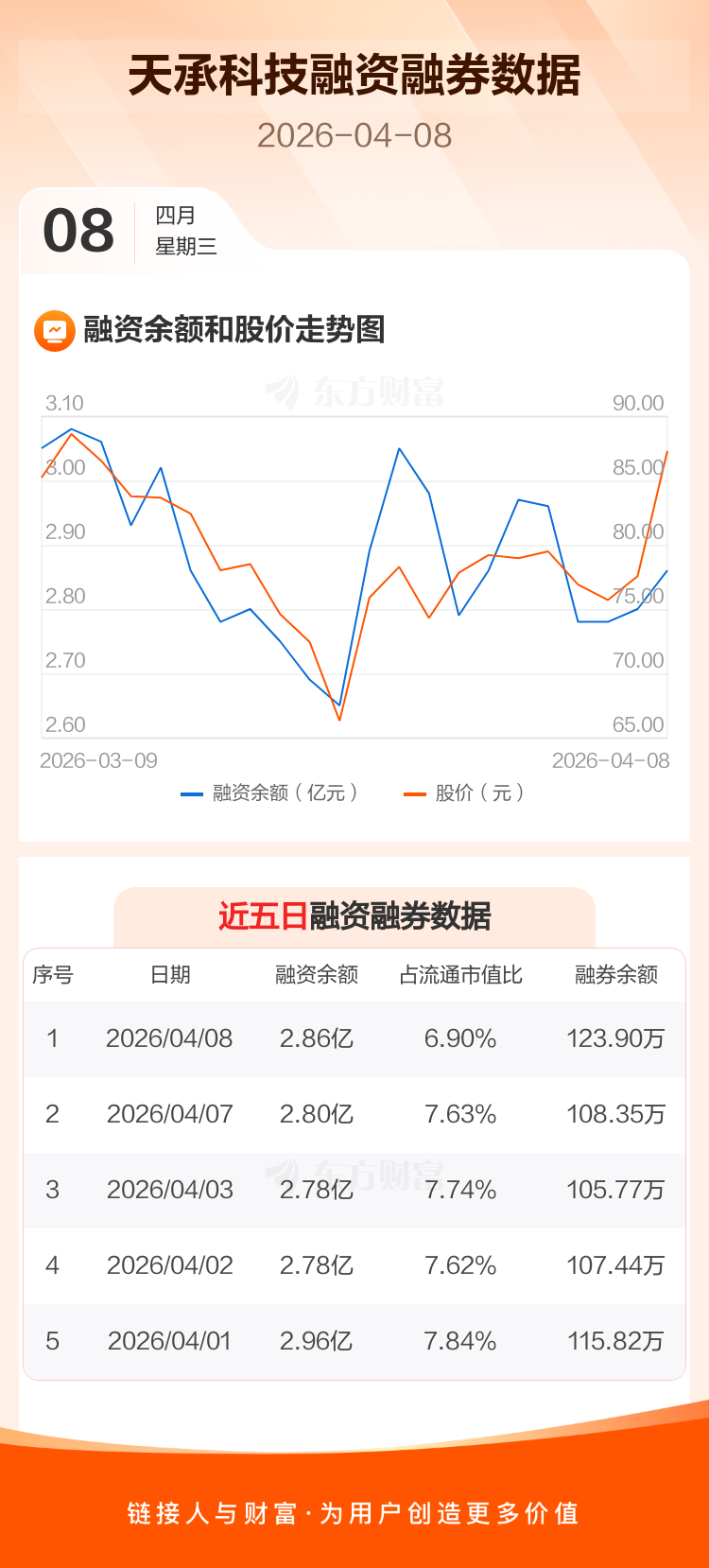 交易所最新数据显示,天承科技于2026年4月8日获融资买入5001.74万元,融资偿还4486.37万元,当日融资净买入515.38万元。目前,该股融资余额2.86亿,占流通市值比例为6.90%。