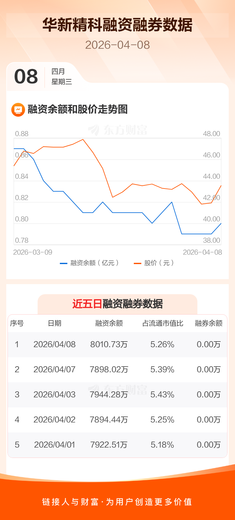 交易所最新数据显示,华新精科于2026年4月8日获融资买入313.32万元,融资偿还200.61万元,当日融资净买入112.71万元。目前,该股融资余额8010.73万,占流通市值比例为5.26%。