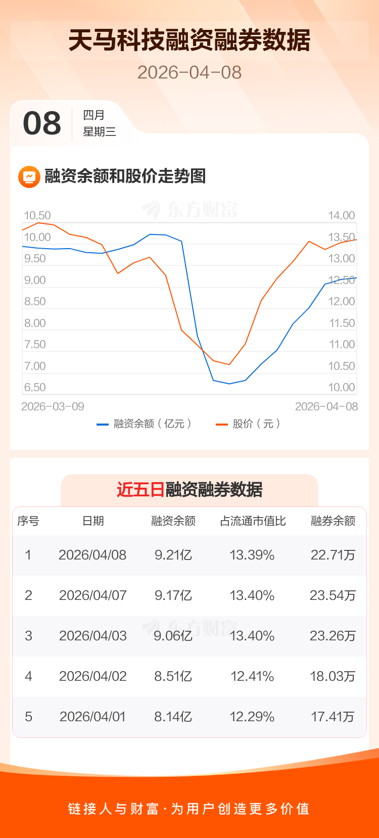 交易所最新数据显示,天马科技于2026年4月8日获融资买入1550.42万元,融资偿还1127.30万元,当日融资净买入423.12万元。目前,该股融资余额9.21亿,占流通市值比例为13.39%。
