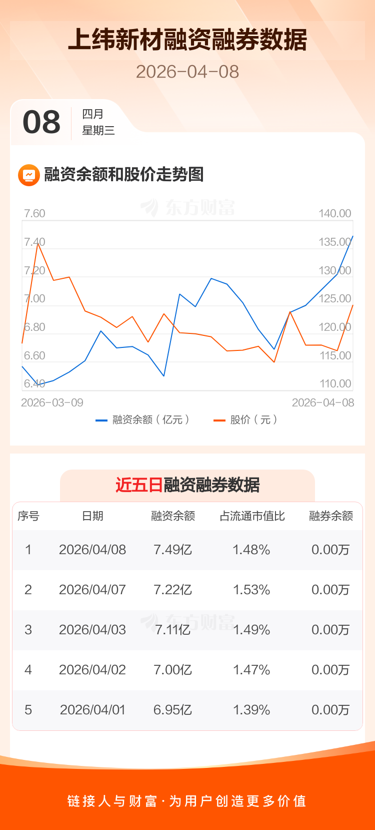 交易所最新数据显示,上纬新材于2026年4月8日获融资买入8855.45万元,融资偿还6167.47万元,当日融资净买入2687.98万元。目前,该股融资余额7.49亿,占流通市值比例为1.48%。
