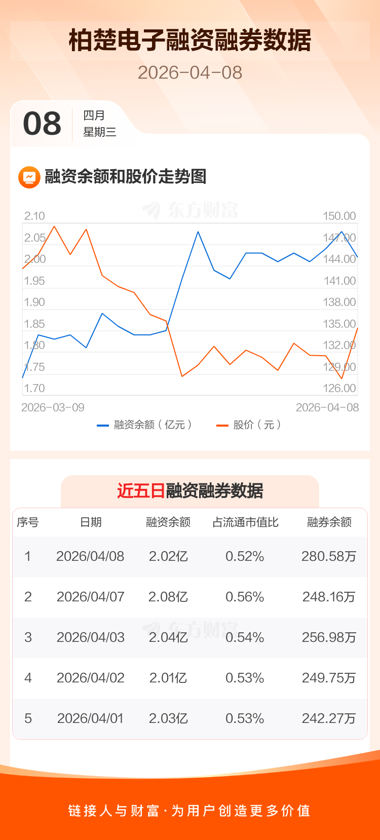 交易所最新数据显示,柏楚电子于2026年4月8日获融资买入1423.00万元,融资偿还2014.34万元,当日融资净偿还591.35万元。目前,该股融资余额2.02亿,占流通市值比例为0.52%。