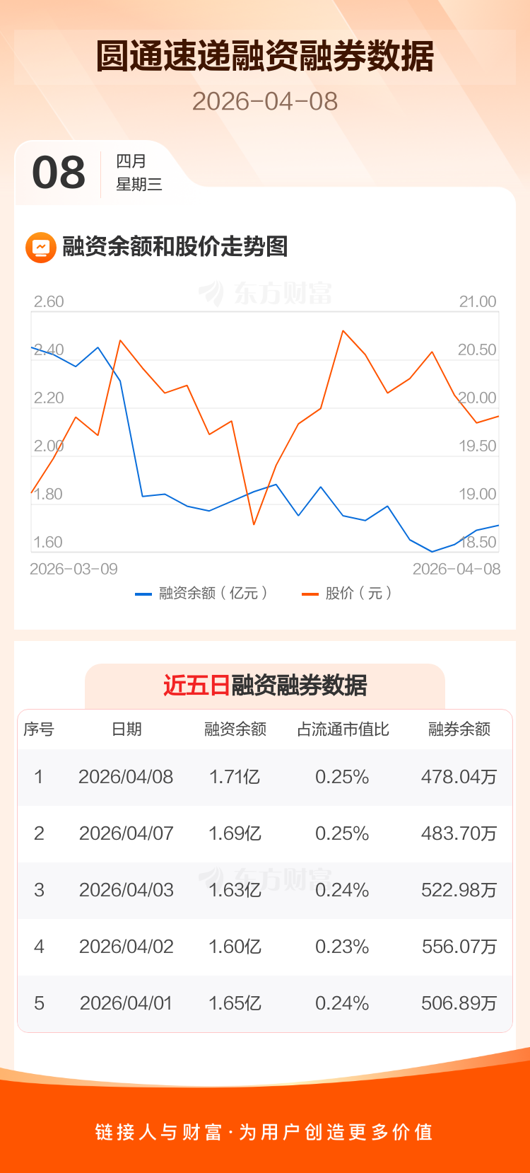交易所最新数据显示,圆通速递于2026年4月8日获融资买入1863.67万元,融资偿还1672.65万元,当日融资净买入191.02万元。目前,该股融资余额1.71亿,占流通市值比例为0.25%。