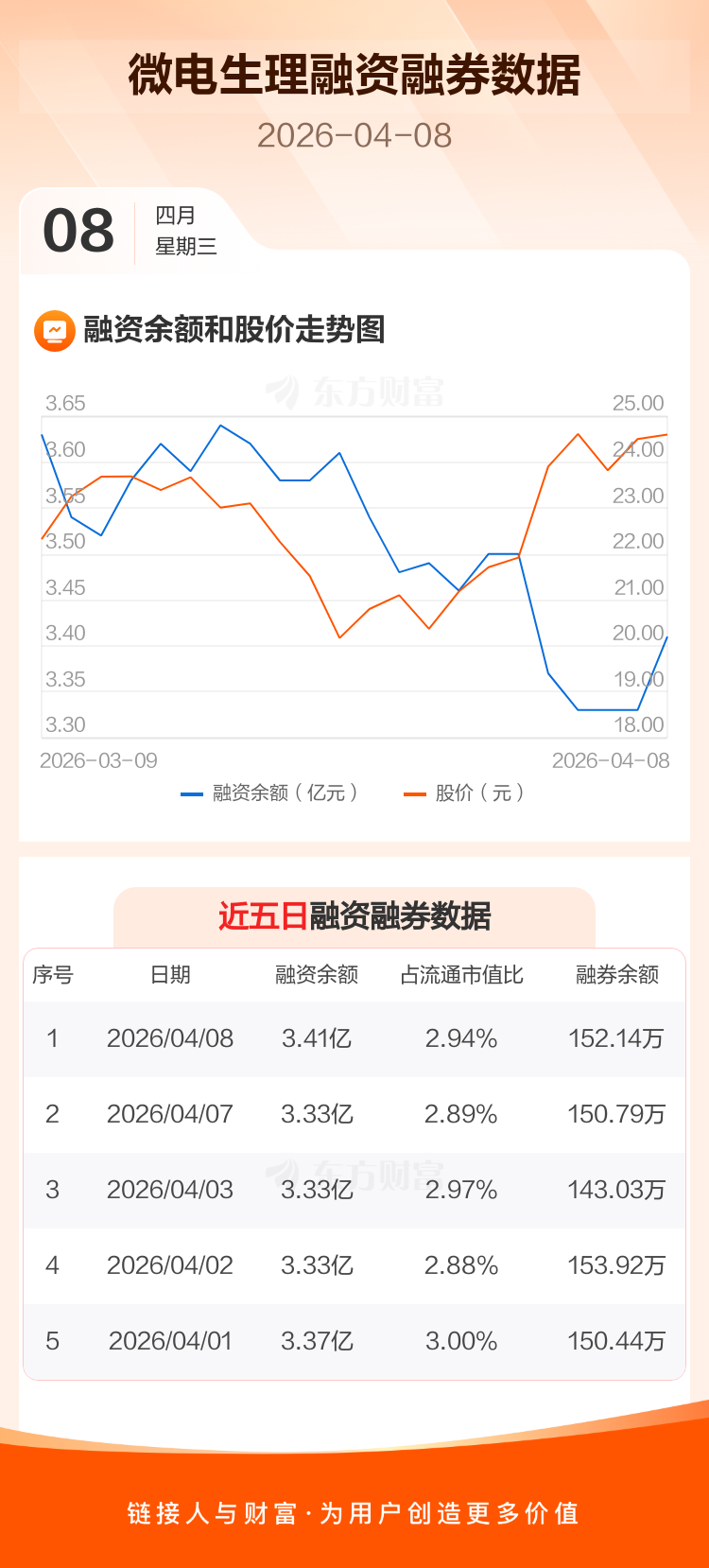 交易所最新数据显示,微电生理于2026年4月8日获融资买入2054.01万元,融资偿还1267.55万元,当日融资净买入786.45万元。目前,该股融资余额3.41亿,占流通市值比例为2.94%。