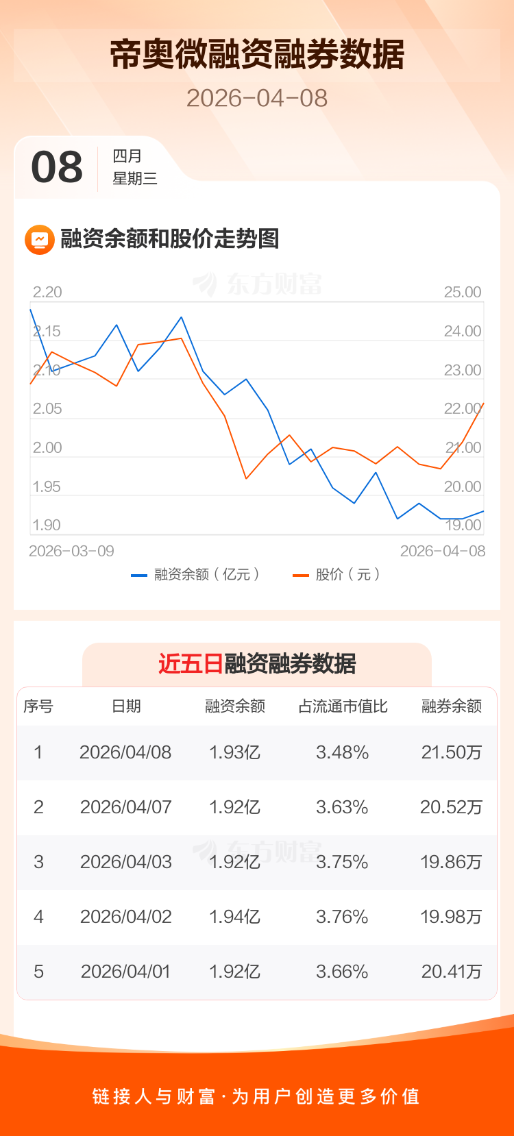 交易所最新数据显示,帝奥微于2026年4月8日获融资买入602.53万元,融资偿还493.40万元,当日融资净买入109.13万元。目前,该股融资余额1.93亿,占流通市值比例为3.48%。