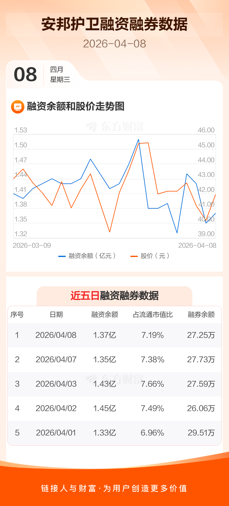 交易所最新数据显示,安邦护卫于2026年4月8日获融资买入902.44万元,融资偿还688.04万元,当日融资净买入214.39万元。目前,该股融资余额1.37亿,占流通市值比例为7.19%。