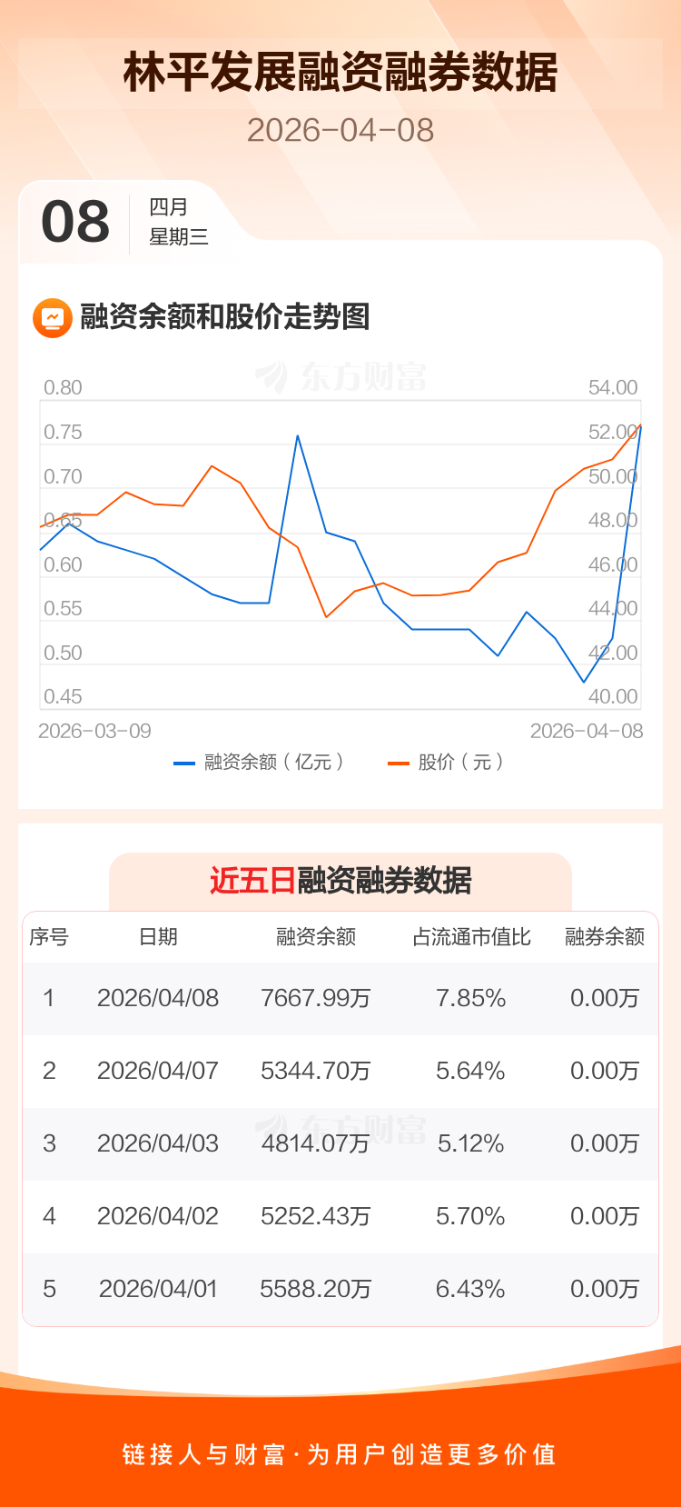 交易所最新数据显示,林平发展于2026年4月8日获融资买入4822.95万元,融资偿还2499.66万元,当日融资净买入2323.29万元。目前,该股融资余额7667.99万,占流通市值比例为7.85%。
