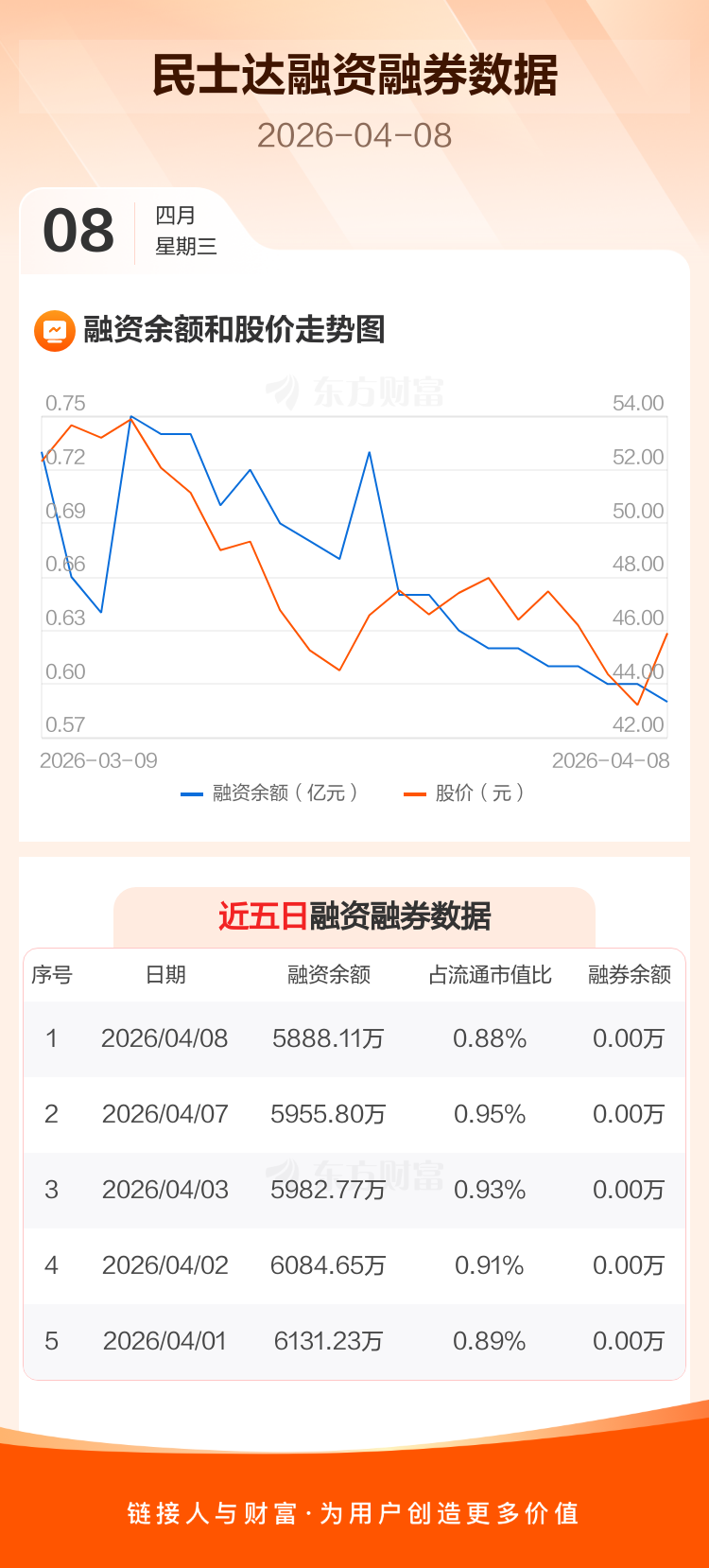 交易所最新数据显示,民士达于2026年4月8日获融资买入178.33万元,融资偿还246.03万元,当日融资净偿还67.7万元。目前,该股融资余额5888.11万,占流通市值比例为0.88%。