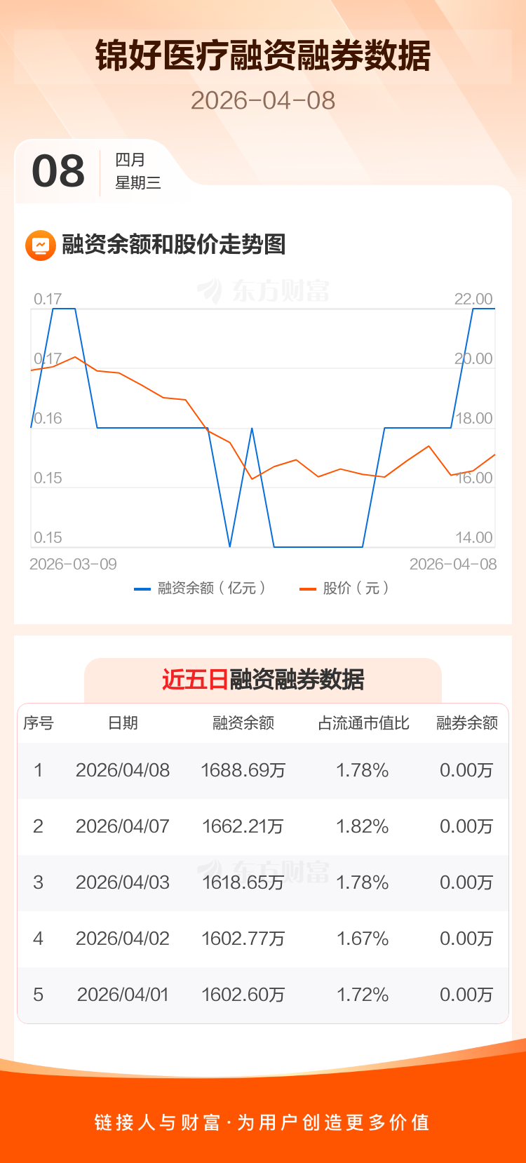 交易所最新数据显示,锦好医疗于2026年4月8日获融资买入73.04万元,融资偿还46.56万元,当日融资净买入26.48万元。目前,该股融资余额1688.69万,占流通市值比例为1.78%。